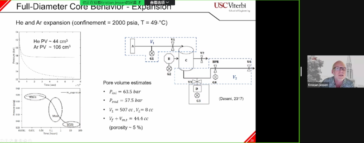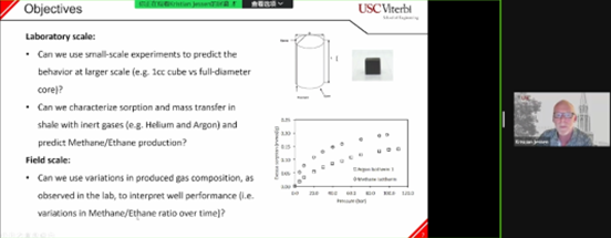 Wei Yan 教授首先向大家介绍Kristian Jessen教授,他在多孔介质中的流动和输运,非理想混合物的相行为和输运特性,枯竭油气藏、盐含水层和煤层中的CO2封存,双曲型高阶守恒方程组的分析与精确求解等领域的贡献,随后Kristian Jessen教授开始了题为:变净应力条件下页岩的传质与吸附研究的主题报告。