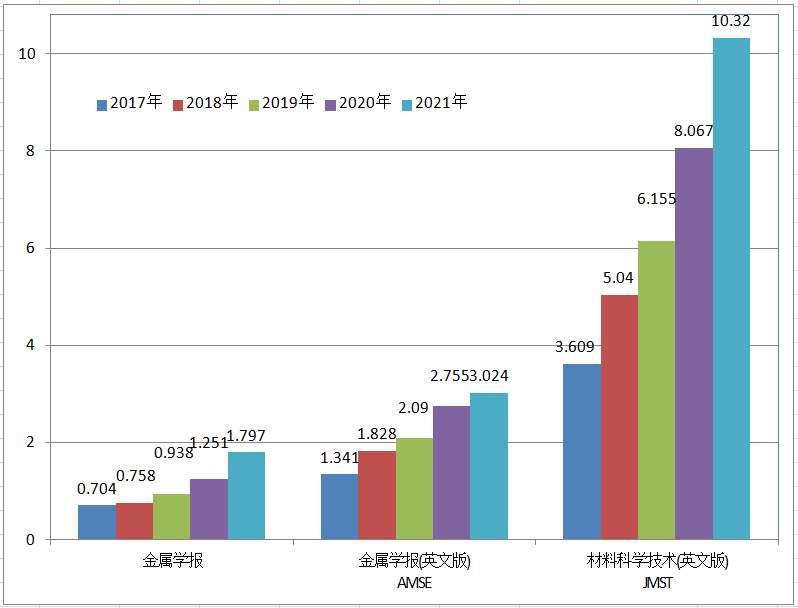 2022年6月28日,科睿唯安 (Clarivate Analytics)发布了2021年《期刊引证报告》(Journal Citation Reports),由中国金属学会主办,中国科学院金属研究所承办的《材料科学技术》(英文版)(Journal of Materials Science & Technology,简称JMST)、《金属学报》(英文版) (Acta Metallurgica Sinica English Letters,简称AMSE)、《金属学报》三种SCI期刊再获佳绩。JMST影响因子突破10,达到10.320,继续稳居两个学科的Q1区;AMSE影响因子创新高,达到3.024,位居冶金类期刊Q1区;《金属学报》作为中文期刊,达到1.797,进入冶金类期刊Q3区。下图为三刊近5年来SCI影响因子变化图。