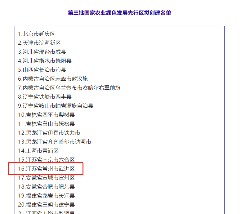 常报新媒体讯(周茜 武农宣) 《第三批国家农业绿色发展先行区拟创建名单公示公告》日前发布,武进区入选创建名单,是全省竞争性类型示范区创建唯一入选地区。
