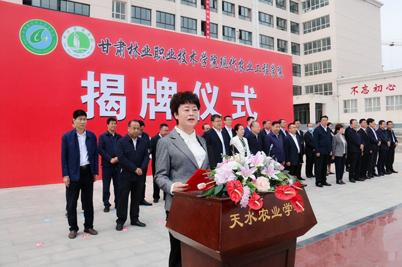揭牌仪式上,刘乃君宣读了批复文件,天水农校党委书记文建水和清水县委副书记、县长李菊霞分别作了致辞。副市长汪小娟代表市委、市政府向甘肃林院现代农业工程学院的成立表示热烈祝贺。