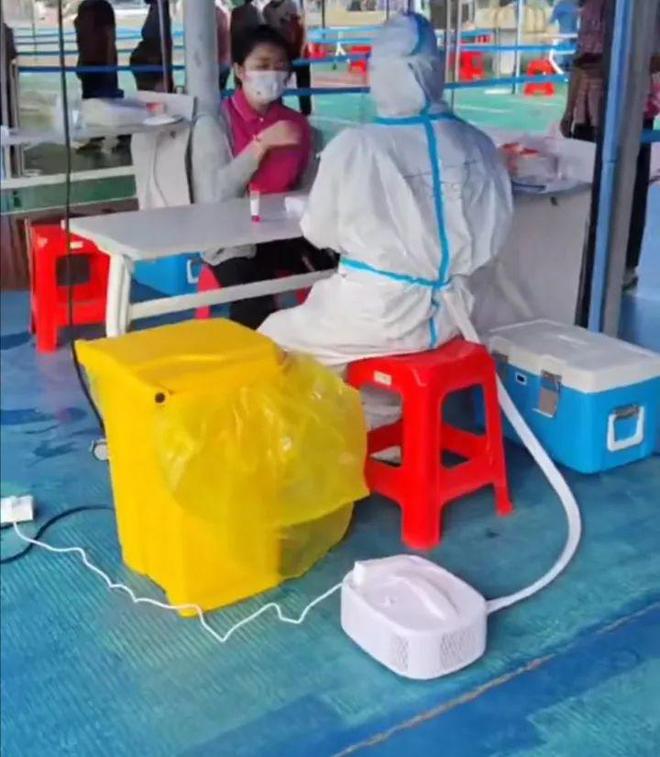 12日,记者在佛山市顺德区容桂街道华口核酸检测点看到,“大白”防护服的背后,有一条长长的“尾巴”,原来这是为核酸检测员配备的降温“神器”!