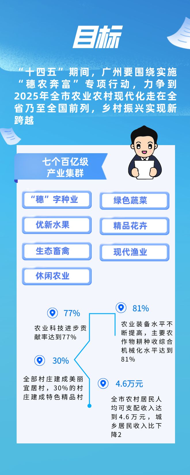 《规划》明确,广州将打造“穗”字种业、绿色蔬菜、优新水果、精品花卉、生态畜禽、现代渔业、休闲农业等七个百亿级产业集群,“米袋子”“菜篮子”“果盘子”更加充盈,农业科技进步贡献率达到77%,农业绿色发展成效显著。