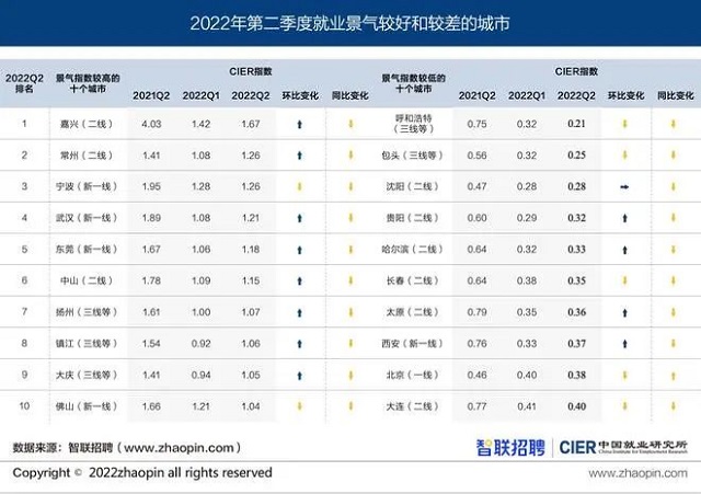 最新发布的2022年二季度《中国就业市场景气报告》显示:常州就业景气指数在全国各大城市中排名第二,省内排名第一。