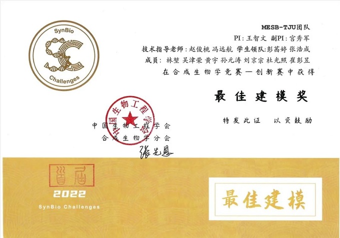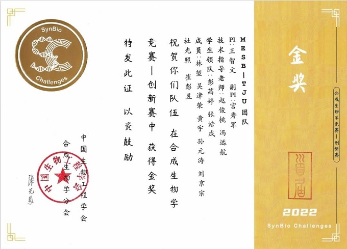 2022年7月9日,由中国生物工程学会合成生物学分会主办的中国首届合成生物学竞赛-创新赛在深圳理工大学(筹)明珠校区成功举办。来自天津大学的MESB_TJU团队斩获大赛金奖和“最佳建模奖”单项奖。该竞赛是中国首届合成生物学领域的国家级大赛,MESB_TJU团队代表天津大学参赛并取得优异成绩。