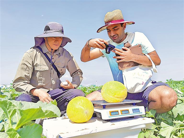 泰金种业土耳其职员穆斯塔法(右)在地里记录甜瓜数据。