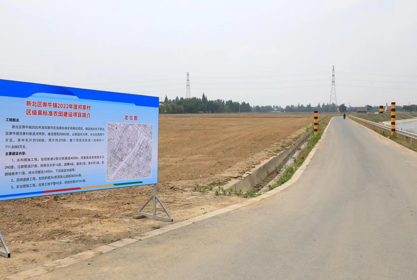 经多方认证征求意见,在金联村已经建设好的300亩高标准农田的基础上,决定在祁家村新孟河两侧建设高标准农田约800亩。奔牛镇采取统一规划、专人负责、创新管理、细化监督、整体推进等办法,通过苗木腾退迁移退林还耕约400亩、整合附加值低的零星土地约50亩、复耕零星鱼塘约50亩,除此之外,通过整治新孟河拓浚堆土区建设约300亩,高效打造了连片水稻种植的高标准农田。