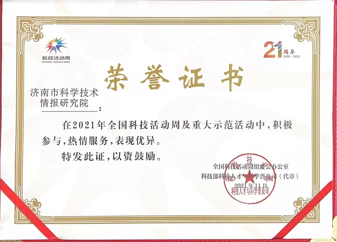 济南市科技情报院荣获2021年全国科技活动周突出贡献奖