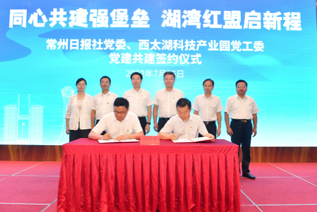 常报新媒体讯(周茜 宋婧) 同心共建强堡垒,湖湾红盟启新程。26日下午,常州日报社党委、西太湖科技产业园党工委党建共建签约仪式在西太湖畔举行,双方将围绕组织建设互促、党员干部互动、党建载体共享、事业发展共进,深度整合资源,组建工作专班,强化党建引领,为推动社会各界聚焦“两湖”、聚力创新注入新动能。
