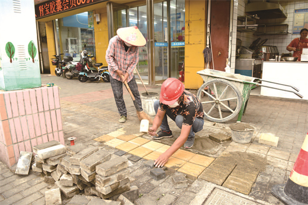 盲道不仅是一条特殊道路,更表达着城市对盲人群体的人文关怀,体现着城市的文明程度。7月18日上午,在南渡镇中心北街,工人们正冒着酷暑对盲道进行改造。