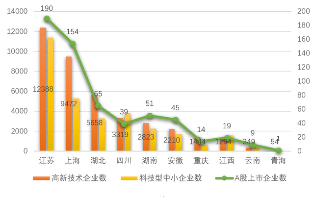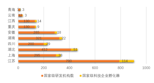 湖北拥有19家国家级开发区,在长江流域位居第二,仅次于江苏(44家),其中国家高新区12家。在不少重要指标方面,处于领先位置。如高新技术企业数、A股上市企业数位居流域第三,次于江苏、上海;国家级研发机构(412家)、国家级科技企业孵化器数量(51家)位居流域第二,仅次于江苏;研发经费内部支出位居流域第三;研发人员折合全时当量位居第二,仅次于江苏,超过上海,等等。