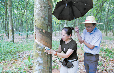 在中国热带农业科学院天然橡胶标准化抚育示范基地,“科创中国”天然橡胶科技服务团专家(左)正在演示电动割胶刀使用方法。 图片由中国科协提供