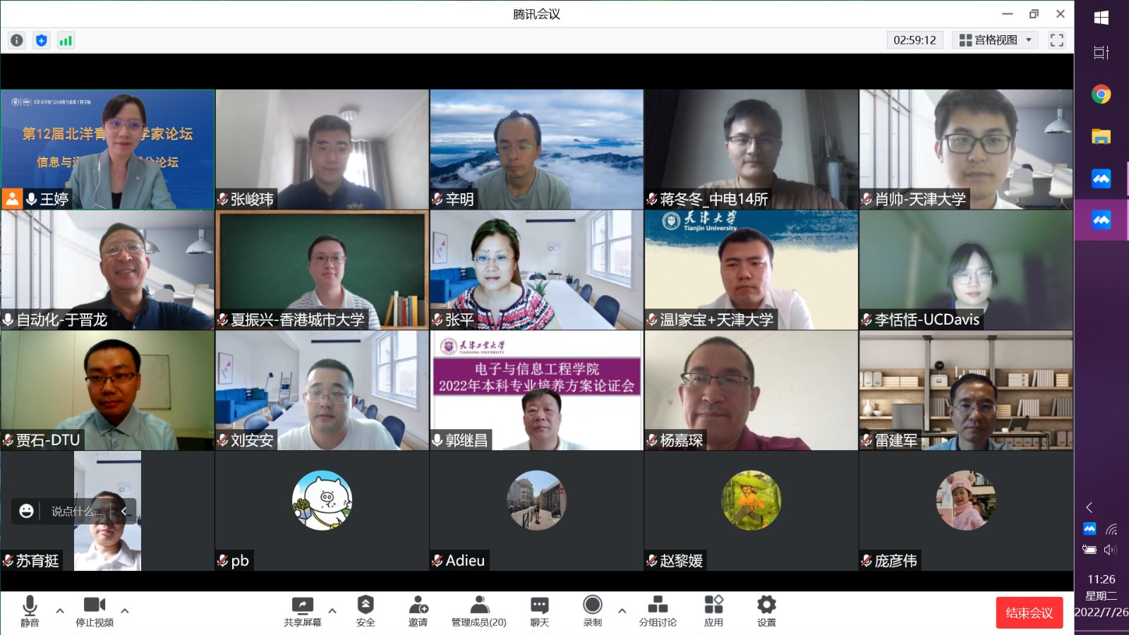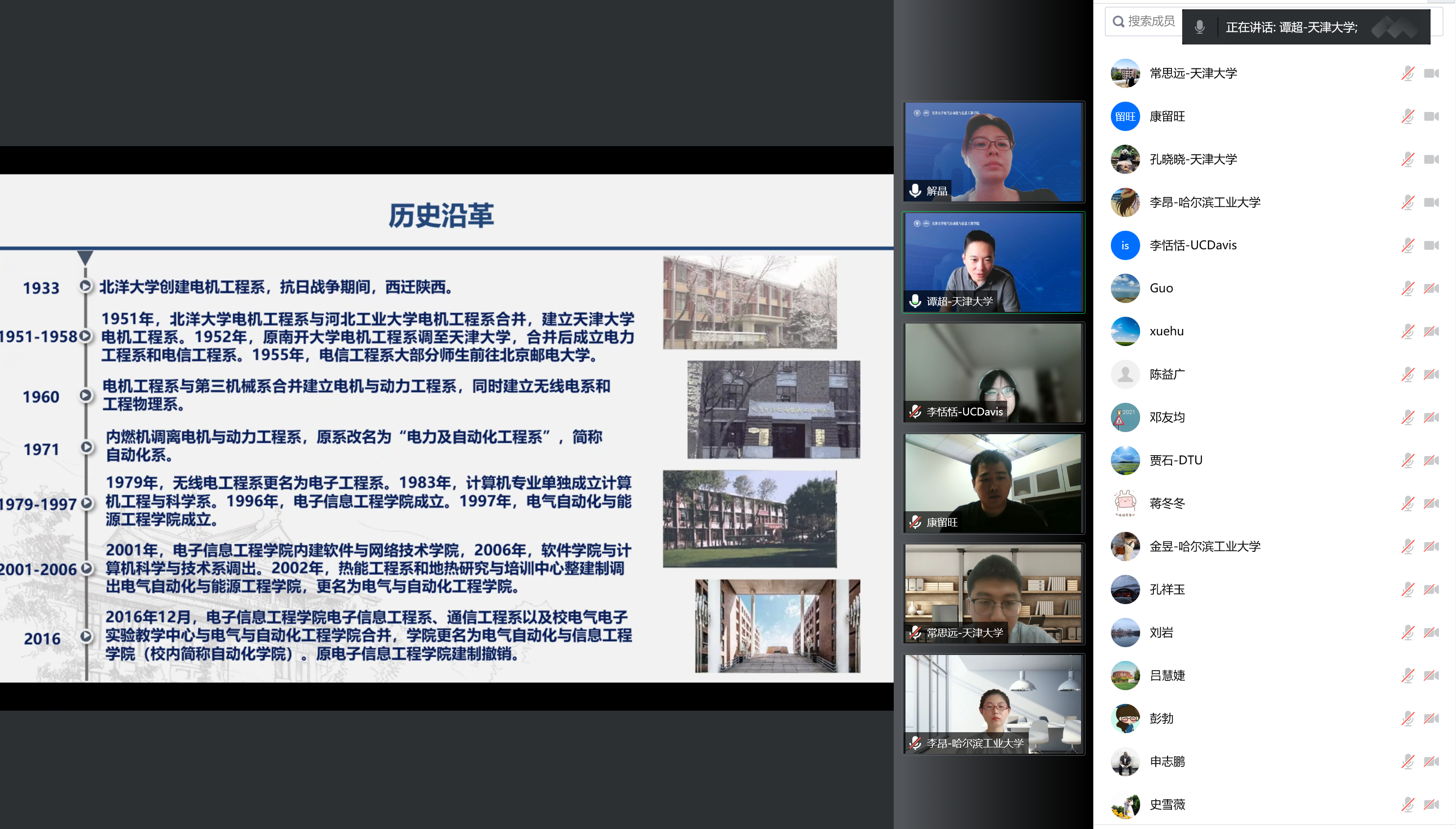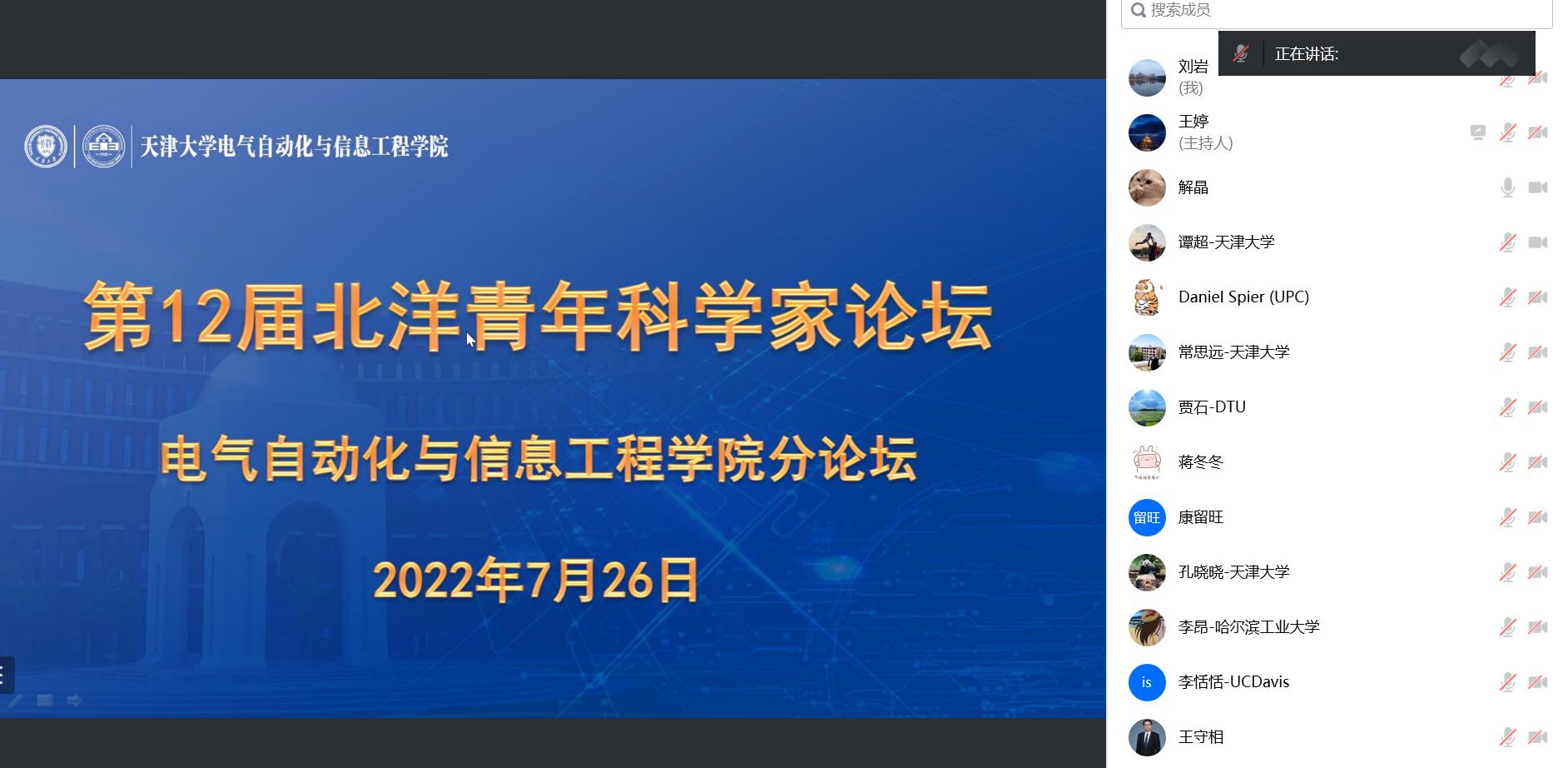 人才兴则事业兴。为落实天津大学第三次人才工作会议精神,进一步汇聚优秀人才,2022年7月26日,第十二届北洋青年科学家论坛电气自动化与信息工程学院(以下简称“自动化学院”)分论坛通过腾讯会议在“云端”顺利举办。来自加州大学、丹麦科技大学、莫斯科鲍曼国立大学、谢菲尔德大学、香港城市大学、天津大学等高校和科研机构的14位海内外优秀青年学者应邀参加论坛,针对电气工程、控制科学与工程、信息与通信工程等领域的国际前沿和热点问题开展交流与研讨。自动化学院院长谭超、各一级学科负责人、师生代表等参加了此次分论坛。分论坛由学院副院长解晶主持。