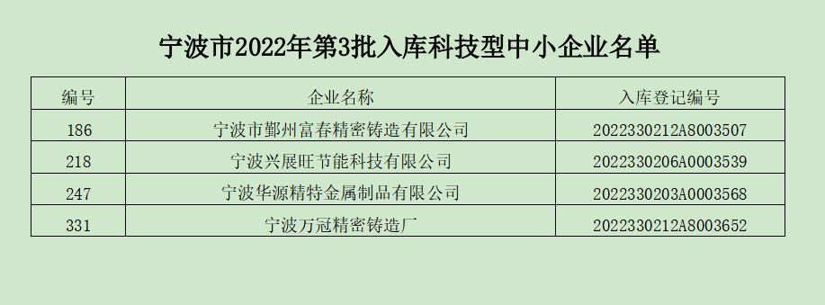 宁波市铸造行业协会会员企业:宁波市鄞州富春精密铸造有限公司、宁波兴展旺节能科技有限公司、宁波华源精特金属制品有限公司、宁波万冠精密铸造厂等4家企业入库“2022年度第三批国家科技型中小企业”。