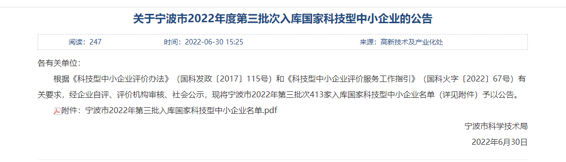 近日,宁波市科学技术局公布了“宁波市2022年度第三批次入库国家科技型中小企业”。