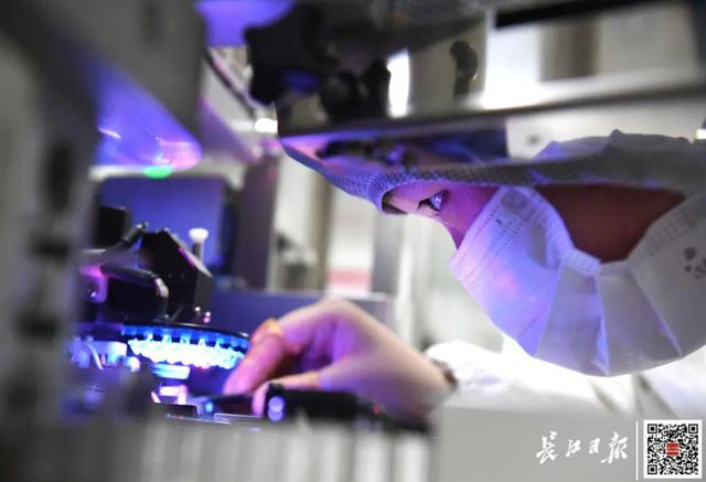 身穿防尘服的华工科技年轻科研人员正一丝不苟检查微小部件。记者高勇 摄