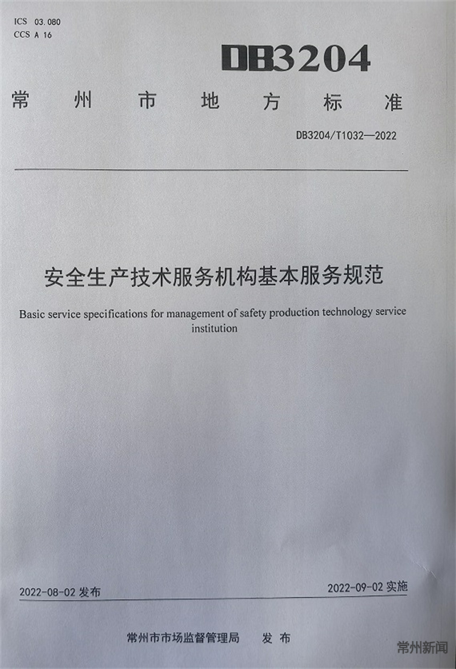 常报新媒体讯(黄洁璐 应急轩) 记者4日从市应急管理局获悉,我市地方标准《安全生产技术服务机构基本服务规范》(DB3204/T1032—2022)已正式发布,将于9月2日正式实施。该地方标准填补了省内对于安全生产技术服务机构相关规范建设的空白。