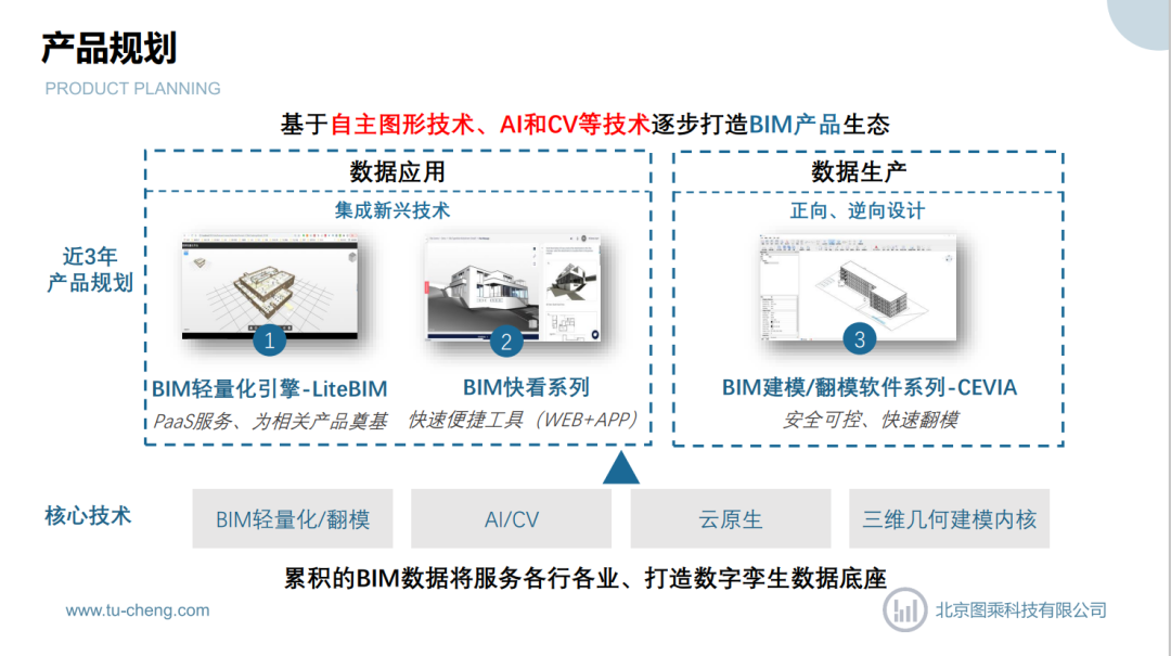 ● 北京图乘科技有限公司以BIM、AI、CV等技术和清华研究成果积累为依托,致力于数字孪生技术在工业与建筑行业的应用并解决相关软件被“卡脖子”问题。公司业务包括BIM轻量化引擎、BIM协同平台、BIM运维解决方案、自主BIM建模软件等,服务于建筑全生命周期。产品具有云端协同、智能预测等特点。借助AI、云端等趋势,有望弯道超车,逐步实现国产化替代。