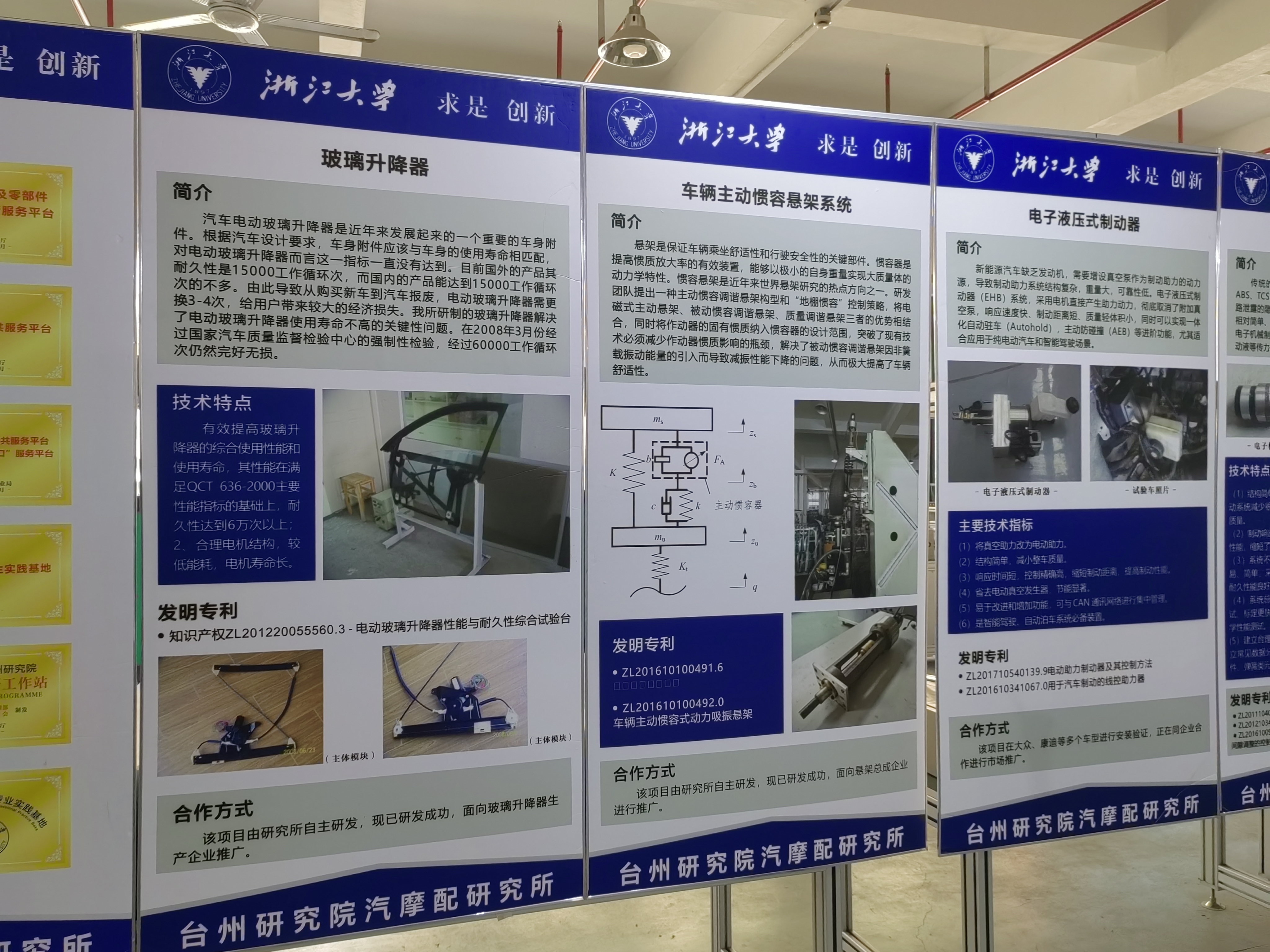 日前,记者来到位于玉环汽车零部件产业服务综合体的浙大台州研究院汽摩配研究所,在产品展示厅内,映入眼帘的是一面挂满专利证书的“专利墙”。专利墙前,是近几年研究所为企业或自主研发的专利产品介绍:玻璃升降器、车辆主动罐容悬架系统、电子液压式制动器……而这些专利技术的核心力量就“藏”在研究所团队人员中。