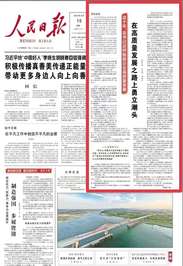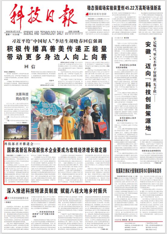 8月15日,《人民日报》、《科技日报》头版也聚焦光谷。其中,《人民日报》推出“这十年,总书记这样勉励企业高质量发展”系列报道,跟随总书记考察调研的足迹,回访总书记勉励过的企业。首篇报道中点赞了烽火科技集团、武汉高德红外股份有限公司——横下一条心,打造“中国芯”;办一个有追求的企业,为国家做点实事。民营经济一定能够实现更大发展。”在文章的最后写道:“中国经济前景光明,中国企业前程远大!”