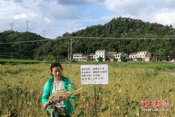 ▲刘宏英在“衡春豆8号”生产示范田里