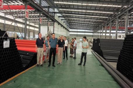 下午,潘教授一行到三雷德化工、鹏威管业车间进行实地考察,并针对三雷德化工提出的提高油漆防腐蚀性能和膜的强度等问题进行了深入交谈。潘教授建议在油漆里面添加新材料能够大大的提高产品性能,三雷德公司艾总表示非常感兴趣,并诚邀潘教授来公司进行实验。
