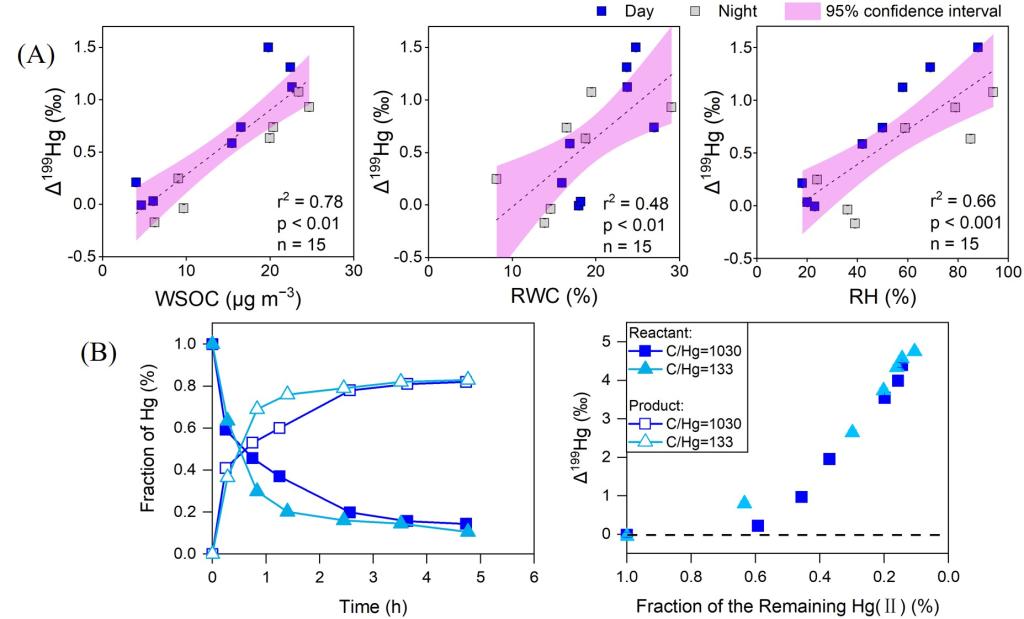 图2 (A)样品Δ199Hg与WSOC、气溶胶含水量(RWC)和相对湿度(RH)呈线性相关
