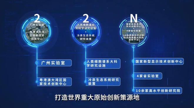 汇聚国家战略科技力量,发挥大院大所大平台集聚优势,建设“2+2+N”科技创新平台体系,打造世界重大原始创新策源地。广州实验室、粤港澳大湾区国家技术创新中心两大“国之重器”挂牌运作,广州在国家科技创新版图中的地位不断强化。人类细胞谱系大科学研究设施、冷泉生态系统研究装置列入国家专项规划,聚力打造大湾区综合性国家科学中心主要承载区。布局建设国家新型显示技术创新中心、4家省实验室和10余家高水平创新研究院,构筑极具核心竞争力的一流科学高地。