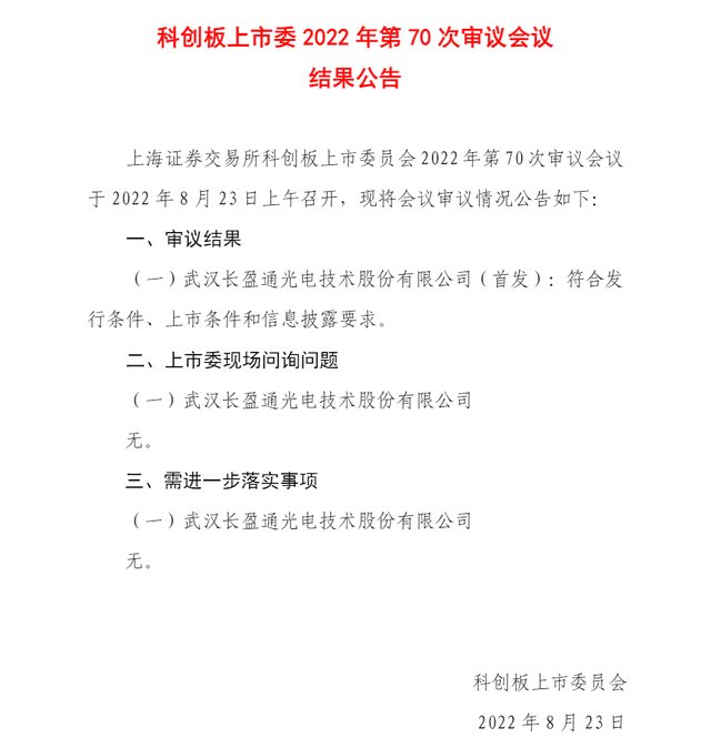 8月23日,上交所科创板上市委员会发布2022年第70次审核会议公告,来自光谷的武汉长盈通光电技术股份有限公司(以下简称“长盈通”)IPO顺利通过。