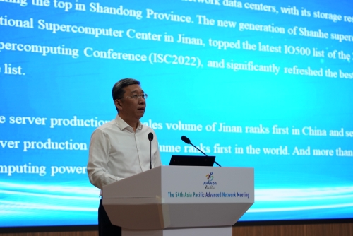 孙斌在致辞中说,济南深入贯彻实施数字中国、网络强国、智慧社会国家战略,加快推动互联网、大数据、区块链、人工智能和实体经济深度融合。目前已建成11个规模较大的互联网数据中心,存储资源居山东省首位;国家超算济南中心新一代山河超级计算机,登顶2022年度国际超算大会最新一期IO 500榜单,并大幅刷新该榜单历史最好成绩;全市服务器产销量全国第一、全球第二,AI服务器产销量全球第一,国内超过50%的AI计算力来自济南;获批建设国家“星火·链网”超级节点,建成开通国家级互联网骨干直联点,发布并启动全球首张确定性网络,济南数字经济和先进制造业双双迈入国家新一线城市前列。2021年济南市与清华大学等五家单位合作成立泉城实验室,主要开展计算机网络技术重大研究课题,建设运行未来互联网试验设施,并将科研成果和管理经验复制推广,这与网络学会的理念和宗旨高度契合。第54届亚太先进网络学会(APAN)学术会议由泉城实验室在济南承办,必将成为APAN历史上又一次非常成功的会议。他希望,以本次会议为契机,与各位专家学者一起,在济南这片崇尚创新、鼓励创新、成就创新的沃土上,打造互联网先进技术的试验场和新高地,为全球先进网络建设,和中国数字经济高质量发展贡献智慧和力量!