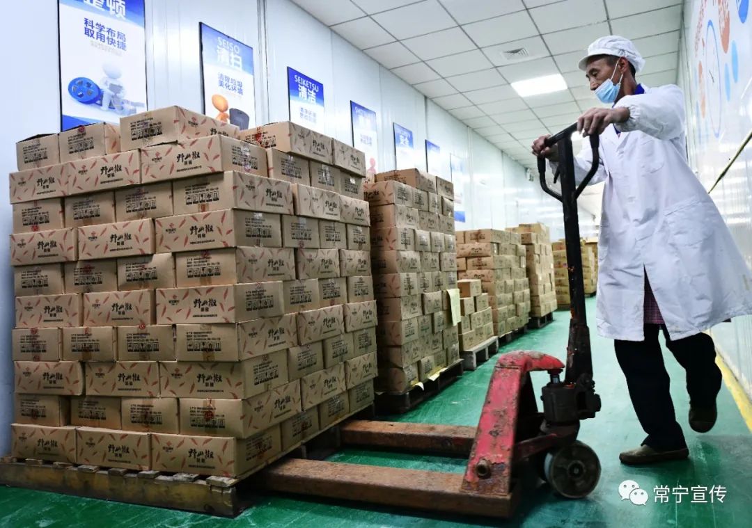 另一边,辣椒加工生产线机器有序运转,一瓶瓶酱辣椒在流水线上流动,经过塑封、贴标、装箱等工序后,生产好的酱辣椒进入仓库等待装车、发货销往全国各地,成为人们餐桌上的美味。