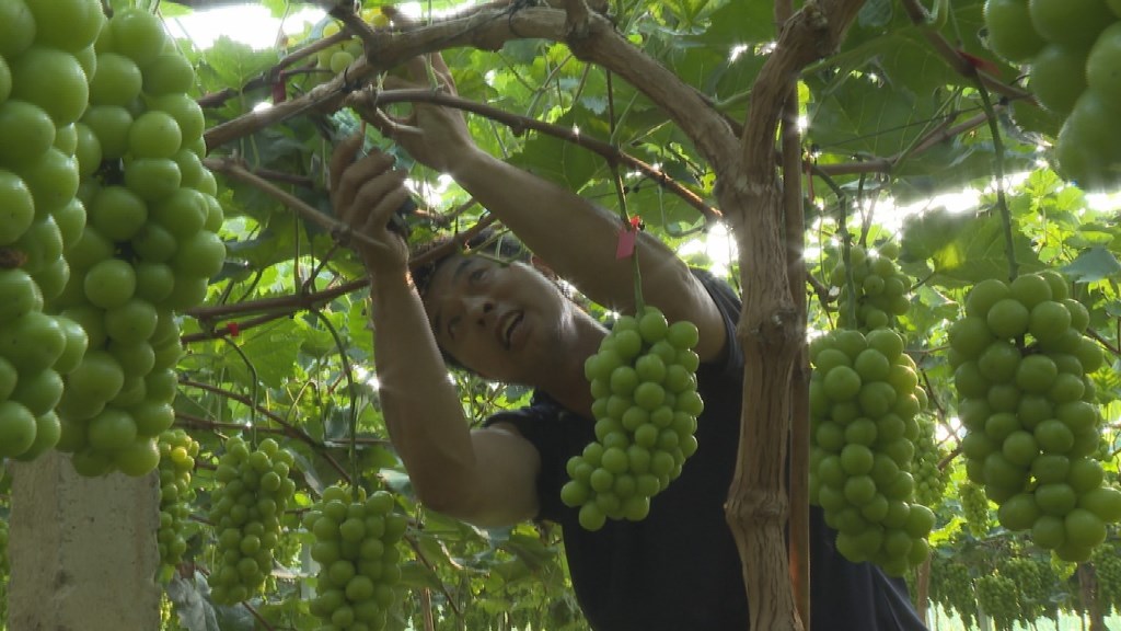 炎炎烈日,走进大屋村楠星生态采摘园,一排排的葡萄架排列整齐,一串串饱满圆润的“阳光玫瑰”挂满枝头,一股股诱人的香味沁人心脾,夏天的甜蜜气息四溢。葡萄专业种植户邓志余正和家人忙碌在果园里,弯腰修果,采摘葡萄,与村干部谈论市场行情。种植户邓志余:“今年应该价格是比较可观的,阳光玫瑰现在价格基本稳定在40块钱一公斤。”