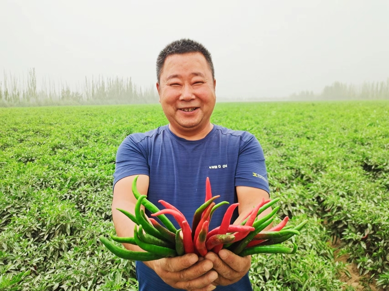 8月24日,在若羌县瓦石峡镇辣椒示范田里,一垄垄成熟的辣椒立在枝头,红灿灿连成一片,辣农们穿梭在辣椒丛中抢摘辣椒,一派丰收景象。辣农梁映武一边摘着辣椒,一边将一个个鲜红的线椒、朝天辣和色素辣椒采装进包装袋里,他说:“辣椒成熟了,迎来丰收,预计亩产500公斤左右。今年收入非常可观,我打算明年继续扩大辣椒种植面积。”