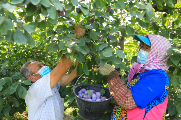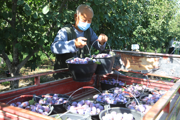 在西梅园里,一颗颗又大又紫的西梅挂满枝头,饱满丰盈、晶莹剔透,密密麻麻地挨在一起,宛如一颗颗璀璨的紫水晶。李广伟是当地有名的西梅种植大户,今年是他种植西梅的第10个年头,地里种植了法兰西、黑玫瑰、红西梅等多个品种。眼下李广伟正搭乘“直播带货”的快车,忙着出售已成熟的西梅,果园里十几名工人采摘、分拣、打包,一派忙碌景象。