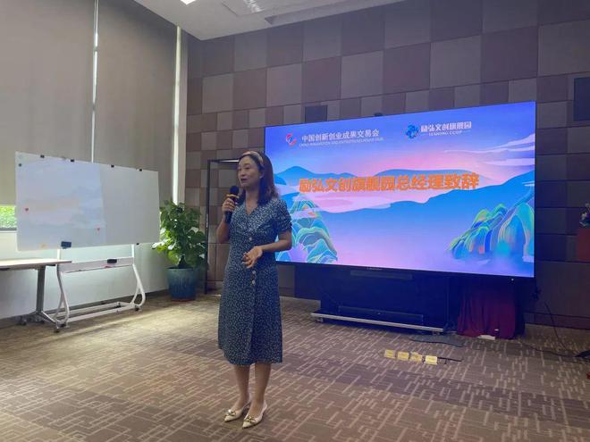励弘文创旗舰园总经理严捷为活动致欢迎辞,严总首先感谢了各位领导、参会嘉宾对于本次活动的支持。严总很荣幸作为成果转化基地加入到创交会之中,通过创交会平台,励弘文创旗舰园将加快产业聚集、生态构建,促进企业创新创业成果的转化,实现高质量发展。严总祝所有参与活动的嘉宾在这次的活动中有所收获。