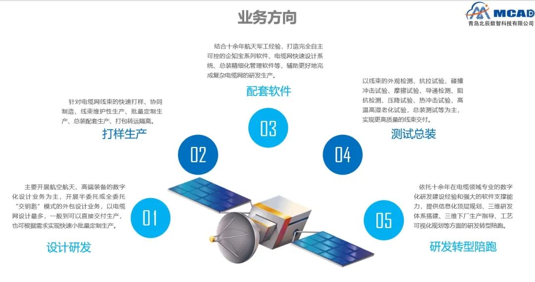 主要开展航空航天、高端装备的数字化设计业务为主,开展半委托或全委托“交钥匙”模式的计业务,以电缆网设计最多,一般到可以直接交付生产,也可根据需求实现快速小批量定制生产