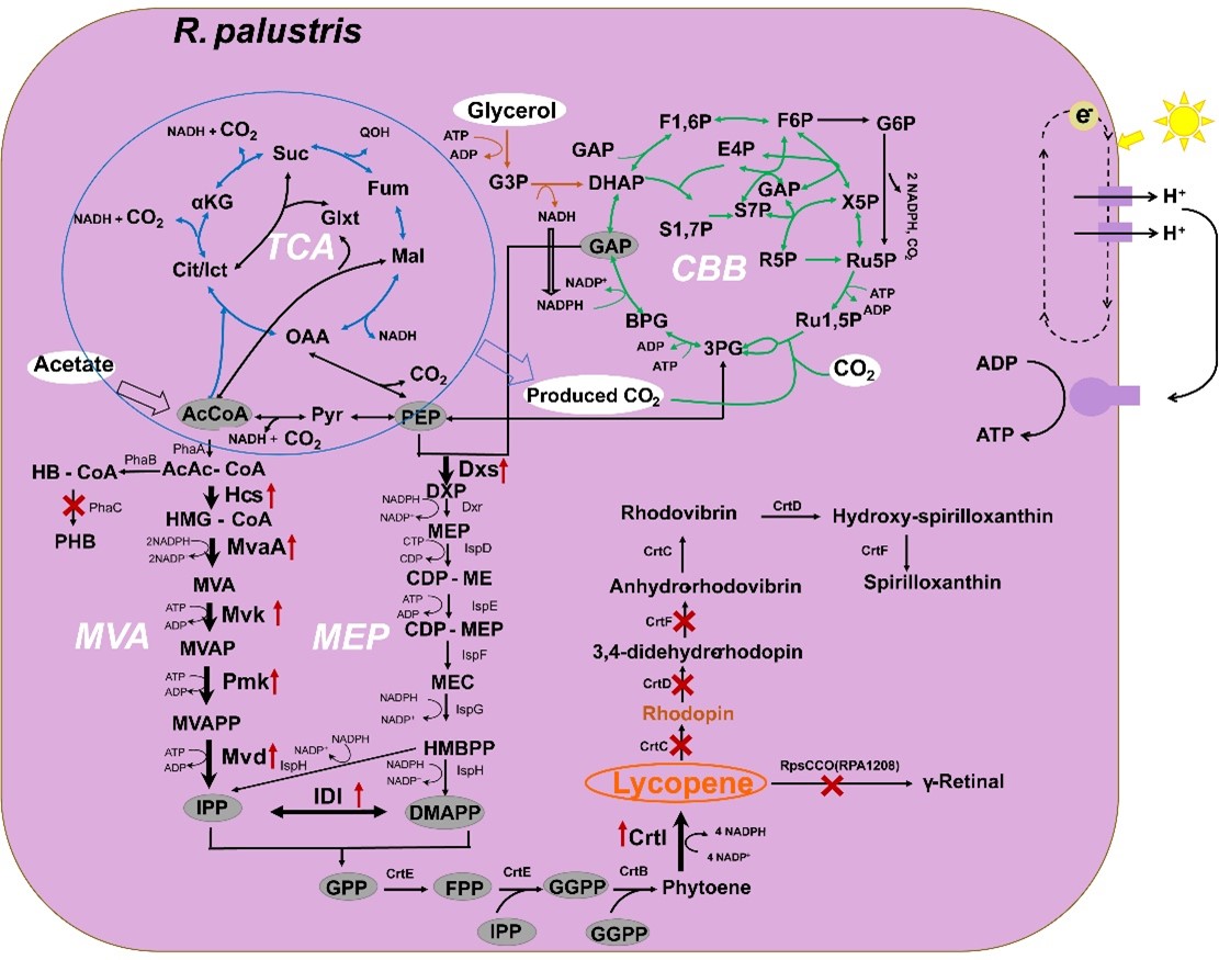 Fig.1 Illustration of the metabolic pathways for carbon source dissimilation and lycopene production in R. palustris