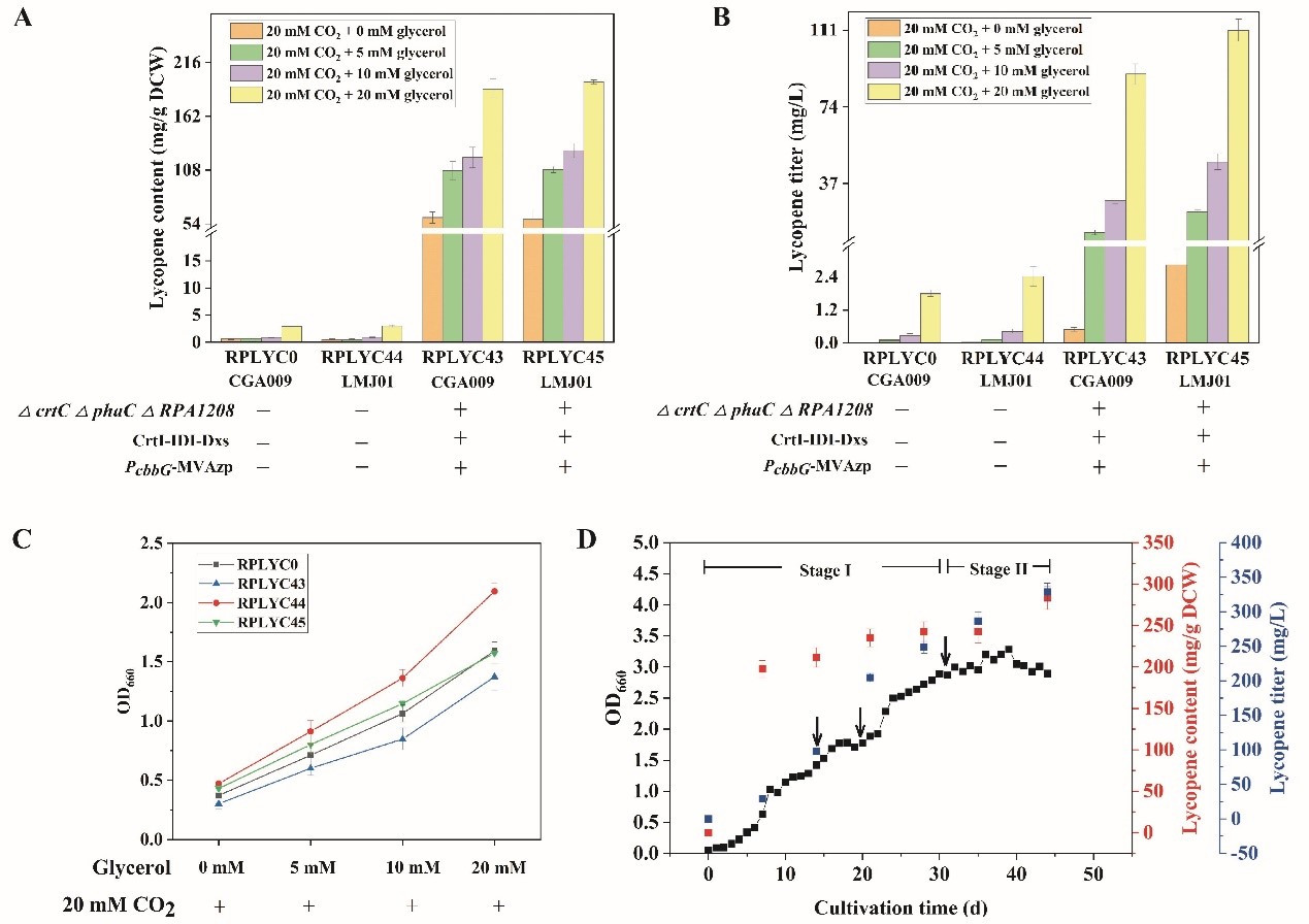 Fig.2 Photosynthesis of lycopene from CO2 and glycerol in engineered R. palustris strain.