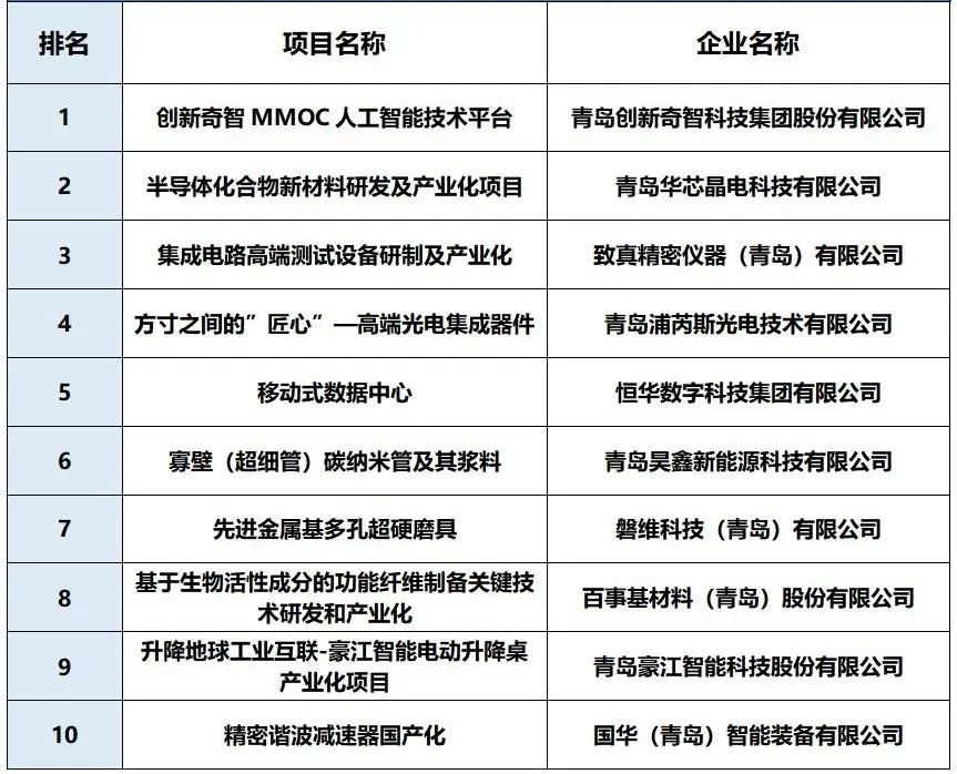 区域赛(企业组)经过激烈角逐,青岛创新奇智科技集团股份有限公司的“创新奇智MMOC人工智能技术平台”项目荣获一等奖,青岛华芯晶电科技有限公司的“半导体化合物新材料研发及产业化”项目和致真精密仪器(青岛)有限公司的“集成电路高端测试设备研制及产业化”项目荣获二等奖,青岛浦芮斯光电技术有限公司的“方寸之间的‘匠心’—高端光电集成技术”项目、恒华数字科技集团有限公司的“移动式数据中心”项目和青岛昊鑫新能源科技有限公司的“寡壁(超细管)碳纳米管及其浆料”项目荣获三等奖;“先进金属基多孔超硬磨具”等19个项目获得优胜奖。各区市民营经济(中小企业)主管部门、青岛开放大学、海创汇、青岛市创业者协会等23个承办协办单位荣获本届大赛最佳组织奖和优秀组织奖。另外,“青颜悦色”--染料创新引领纺织产业绿色发展、纳米抗体--精准医疗的“芯片”、无人机智慧农业服务系统、MASS一体化工业互联网平台等创客赛、“乡村振兴”专题赛、城市邀请赛获奖项目分别进行了线上路演展示。赛后,大赛组委会将推荐部分优质项目参与工信部“创客中国”大赛全国500强、50强评选,其中晋级50强的项目将参加全国总决赛。