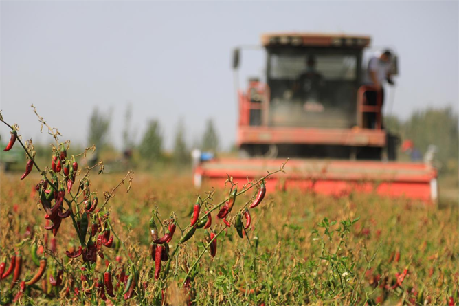 依托得天独厚的自然光热资源和水土资源,博湖县种植的色素辣椒色泽鲜艳纯正、红色素含量高、产量高,是辣椒酱、加工红色素的上好原料。多年来,辣椒种植已经成为全县的红色支柱产业。据博湖县农业农村局统计,全县色素辣椒种植面积达6.7万亩,今年开始加大推广机械化采收,组织农机人员做好技术服务和安全生产检查,手把手指导农机手进行机械化采摘和安全生产。