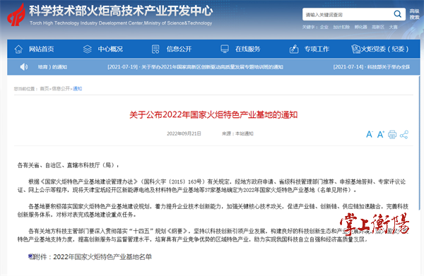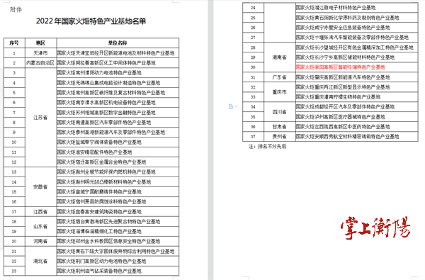 掌上衡阳9月21日讯 (全媒体记者邓小山 通讯员刘君山) 9月21日,科技部火炬中心公布2022年国家火炬特色产业基地名单,国家火炬衡阳高新区智能终端特色产业基地上榜。