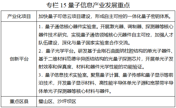 瞄准未来信息技术和社会发展的重大需求,围绕量子通信、量子计算等领域,发挥我市半导体光电器件的技术优势,开展光量子芯片、量子加密、量子显示、量子中继、量子存储、量子精密测量等关键技术研究,大力发展量子信息领域的核心材料和器件。积极参与量子保密通信干线建设,在工业互联网、金融科技、智慧城市、电子政务等领域开展应用试点。