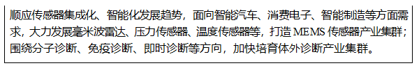 提升先进传感器和智能仪器仪表产业发展能级。面向我市智能终端、智能汽车、智能制造和智慧城市等领域应用需求,发展互补金属氧化物半导体(CMOS)图像传感器、车身传感器/控制器、超声波传感器、流量传感器、惯性传感器、位移传感器、智能安防设备等传感设备。支持龙头企业整合市内外创新资源建设国家级产业创新平台,牵头开展核心技术攻关、产业孵化、产业招商等工作,提升产业发展能级。依托汽车、智能终端、装备制造等产业优势,加强产业链上下游合作,完善先进传感器及智能仪器仪表配套体系。