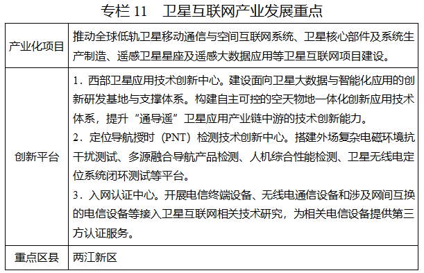 抢抓卫星互联网发展机遇,深化与中国星网集团合作,加快布局国家卫星互联网系统设计、建设、运营服务等。卫星通信方面,加快构建海、陆、空、天一体化新型信息网络,实现面向全球的移动通信、物联网、宽带互联网等应用及运营服务;在核心芯片、模组终端等领域引进培育一批具有国内先进水平的产品供应商。卫星导航方面,发展导航服务,研发高精度、高性能系统级芯片和通用导航芯片,导航终端和授时终端,遥感技术、地理信息系统、全球定位系统(3S)软件。卫星遥感方面,加强航空航天遥感影像数据统筹管理,建设全市遥感影像统筹服务系统;研发遥感影像数据产品,提升遥感影像政用价值,积极拓展精准农业、自动驾驶、电力通信、石油管道、地下管网等领域商业化应用。探索发展卫星本体制造产业。开展民用运载火箭及推进器、核心配套设备和零部件的研发生产和总装测试。