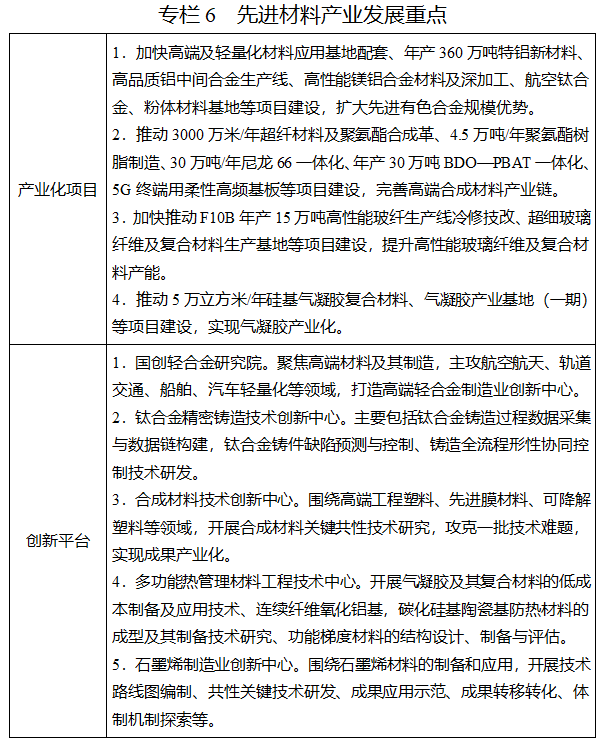 面向国家重大工程建设、提升主导产业核心竞争力和实现“双碳”目标的迫切需求,进一步延伸先进有色合金、高端合成材料、高性能纤维及复合材料等产业链,加快气凝胶、石墨烯等前沿新材料产业化、工程化步伐。