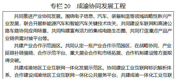 积极推动成渝地区双城经济圈产业协同发展,共同打造新一代信息技术、新能源汽车和智能汽车、高端装备制造、先进材料等具有国际竞争力的产业集群,优先在集成电路、新型显示、智能汽车等重点产业延链补链强链上取得突破,力争实现产业链供应链自主可控,共同争取建设国家战略性新兴产业基地,共同打造一批合作示范园区。联合建设汽车、智能终端等重点产品产业链供需对接平台,鼓励引导两地企业积极融入对方供应链体系,加强产业政策引导,促进两地集成电路代工制造企业加强与对方设计、封装企业间的合作。鼓励成渝两地企业深化合作,互设研发机构,互建生产基地。联合争取国家布局建设高水平科技创新基地,共建生命科学、医学科学、地球科学等领域重点实验室。实施成渝科技创新合作计划,聚焦人工智能、生物医药、绿色环保等重点领域,共同出资联合开展共性关键核心技术攻关。深入推进成渝地区工业互联网一体化发展示范区建设,共同打造国家大数据中心核心节点,为产业发展赋能。支持两地知名高校与对方各市(州)深度合作,加强研究生联合培养,解决创新人才短缺问题。探索共同设立成渝地区战略性新兴产业股权投资基金,专项支持合作示范园区产业发展和重大项目落地。完善推动成渝地区战略性新兴产业协同发展组织领导和实施工作机制,确保议定事项有力有序推进。