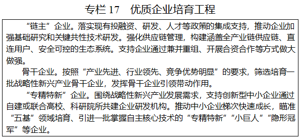 围绕集成电路、新型显示、新能源汽车和智能汽车、卫星互联网等领域培育集聚具有产业生态主导地位、核心技术能力突出的产业链“链主”企业。鼓励“链主”企业整合产业资源和创新要素,推广供应链协同、创新能力共享、数据协同开放和产业生态融通发展等模式,带动上下游中小微企业协同发展。聚焦产业链关键环节和核心技术,筛选培育一批主业突出、关联度大、创新能力强、市场潜力大的骨干企业。瞄准核心基础零部件及元器件、基础软件、关键基础材料、先进基础工艺、产业技术基础等“五基”领域,促进中小企业向“专精特新”方向发展。按照国家部署,适时启动战略性新兴产业优质成长性企业培育工作。