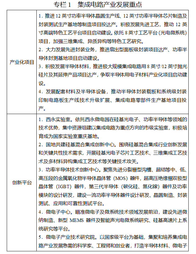 以整合元件制造(IDM)模式为主要路径,聚焦特色制造工艺、化合物半导体、封装测试等方向,坚持区域集聚,以应用为牵引,以骨干企业为依托,以重大项目为抓手,持续扩大功率半导体领域优势地位,推进硅基光电子技术产业化,加快发展化合物半导体材料及芯片、模拟和数模混合芯片、微机电系统(MEMS)等产品,打造全国最大的功率半导体产业基地和集成电路特色工艺技术高地,建成特色鲜明的国家级集成电路产业集群。