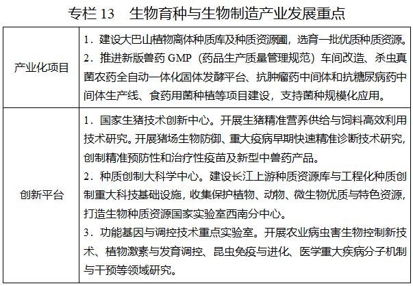 极培育“育繁推一体化”种业企业,重点突破一批绿色优质高效的水稻、油菜、马铃薯、茶树、果树、蔬菜、畜禽、水产和特种经济动物等新品种,打造从资源、品种到应用的全产业创新链条和体系,积极争取建设一批国家种子基地。聚焦医药、农产品、乳制品领域的核心菌种,攻克化学原料药生物合成、植物天然产物的发酵制造、食品制造等技术,发展生物发酵原料药和酶催化医药中间体,微生态制剂、兽药及疫苗、农用抗生素用菌种,功能性益生菌及产品,冬虫夏草、灵芝、灰树花等名贵品种食药用菌。谋划建设人体微生态研究及产业转化种子资源库、药用微生物菌种等保藏管理中心。加强基因组化学合成、生物体系设计再造、人工生物调控等合成生物技术研发,培育合成生物产业链。