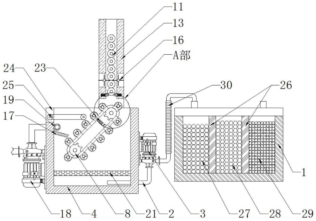 本发明涉及水产养殖设备技术领域。主动轴的两端固定穿过两侧的主动齿轮后,与储水池的前后两侧壁旋接;驱动电机与主动轴的后端固定连接;从动轴的两端固定穿过两侧的从动齿轮后,与储水池的前后两侧壁旋接;珊瑚绒辊两端的转动轴插设在夹座内;挡板的前后两侧固定在前后两侧的支撑板的内壁上,挡条嵌设在挡板的一侧壁上;抵触弹簧嵌设在两侧的挡板内,驱动机构设置于两个支撑板之间;分流管与二号抽水泵的出水端连接,分流管设有通孔,珊瑚绒辊对养虾尾水中的微藻进行过滤并收集,在光照条件下进而形成稳定的藻菌共生生物被膜体系,可以用于养虾尾水的脱氮除磷,并在一定程度降低COD,经过处理后的养虾尾水进入处理室后进行深度生化处理,可实现养殖尾水的达标排放。
