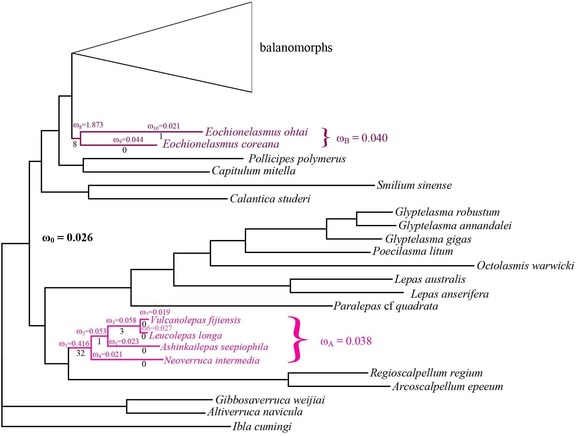 基于PAML分支和分支-位点模型的选择压力分析表明化能生境蔓足类两个支系的线粒体基因组具有相似的选择压力响应模式,但同时也呈现出应对压力的基因组特异性。结合白垩纪生物大灭绝、森诺曼阶\土仑阶海洋缺氧事件造成的深海生态位空缺和围胸类微生境可塑性,研究认为一种整合的物种形成和多样化假说,即生态事件诱发(如生态位空缺、生存要素改变),基因特异性响应,生态位细分是促使深海蔓足类演化的潜在机制。